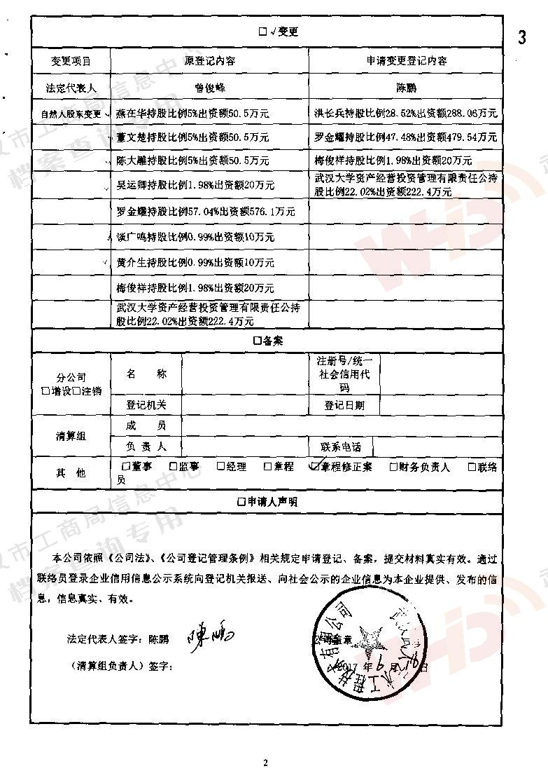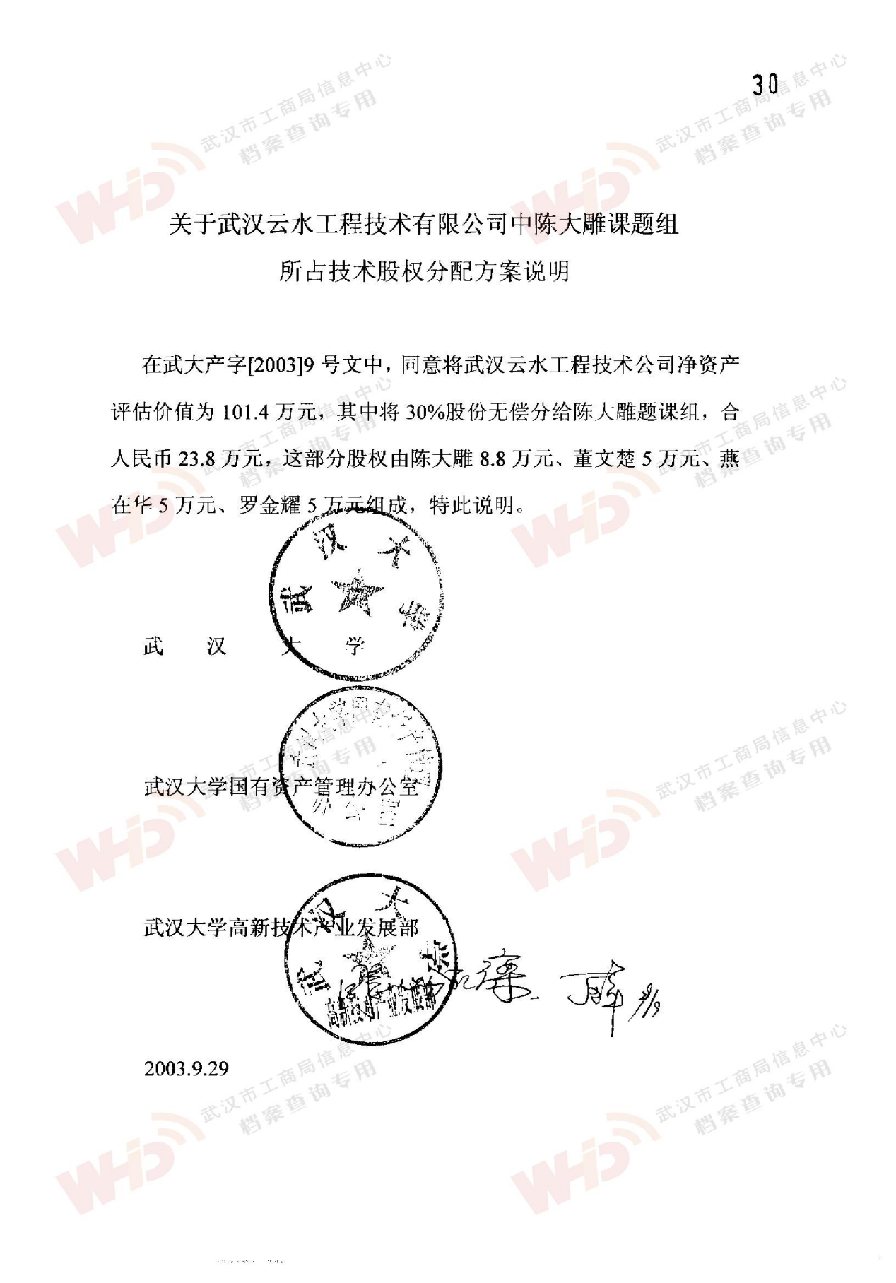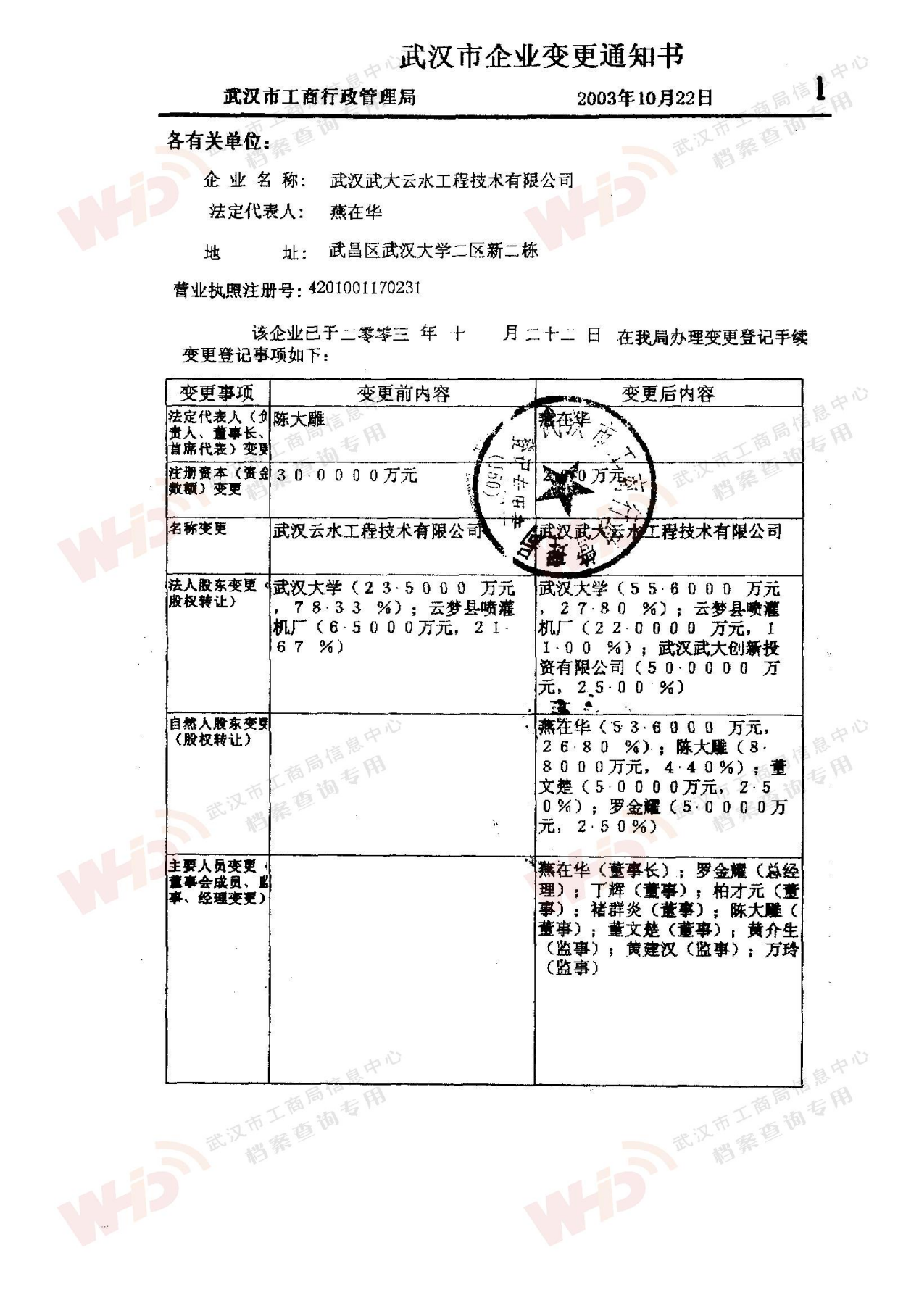 - 2003年7月25日公司名變更為武漢武大云水工程技術有限公司。武漢大學同意使用“武大”冠名。