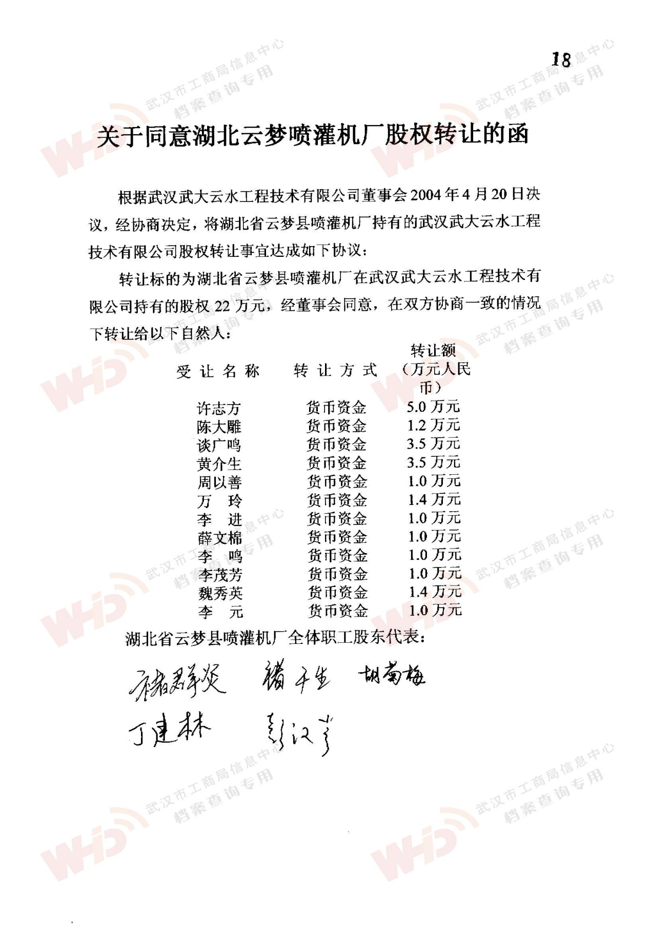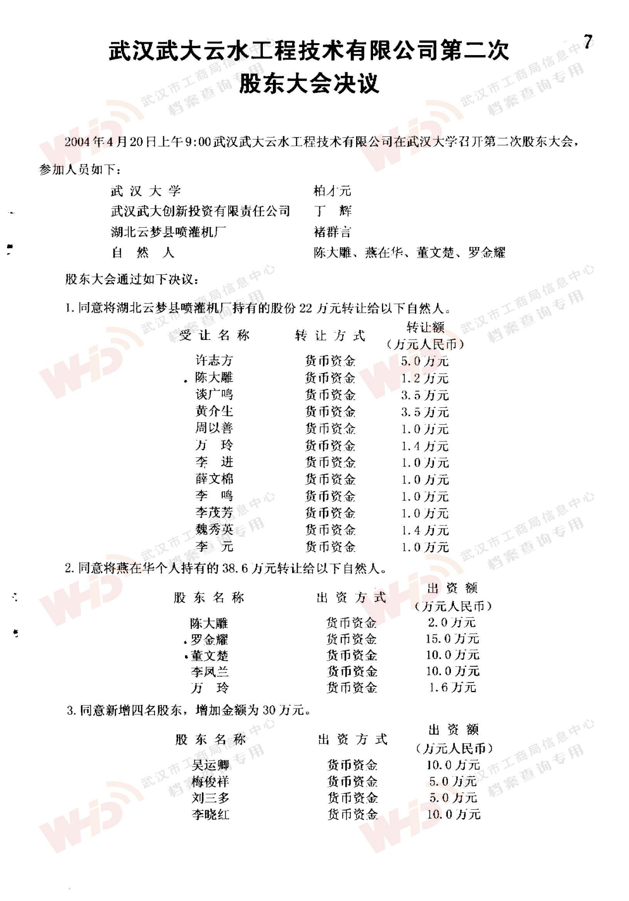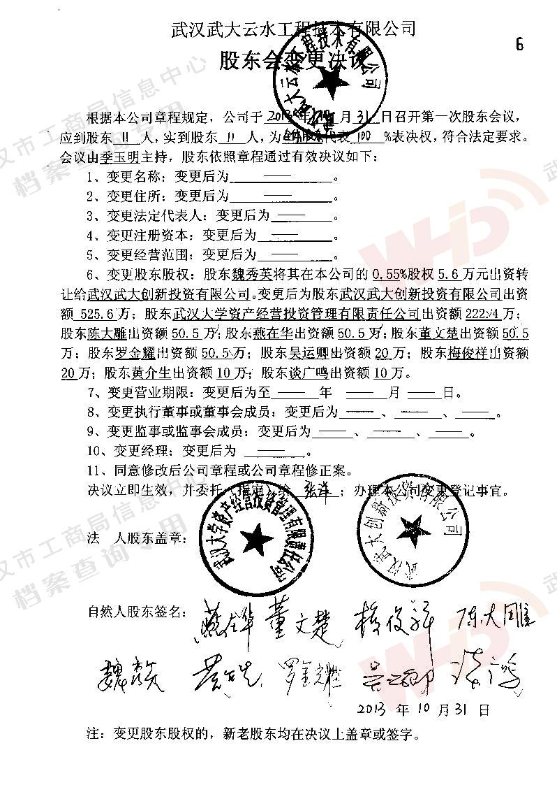 - 2009年11月15日武漢武大云水工程技術有限公司三屆一次董事會決議: 一、決定聘請談廣鳴為公司名譽董事長。 二、決定選舉季玉明為公司董事長,公司法人代表。免去燕在華公司董事長職務。 三、經董事長季玉明提名,決定聘任羅金耀為公司總經理。 四、經公司總經理提名,決定聘任劉軍強為公司副總經理。 五、經公司總經理提名,決定聘任龔明新為公司財務總監,燕在華為市場總監,陳大雕為技術總監,董文楚為研究所所長。 經董事長提名,決定聘任萬玲為董事會秘書。